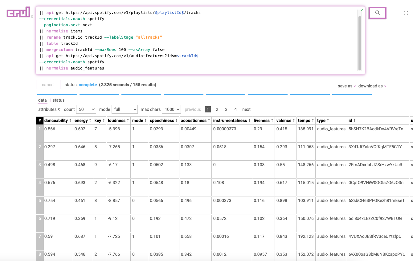 To keep things simple, we'll start with a pair of playlists that we can use as an initial list of tracks to further categorize. This is also a demonstration of how you can import files into crul as seeds for API calls or other processing.